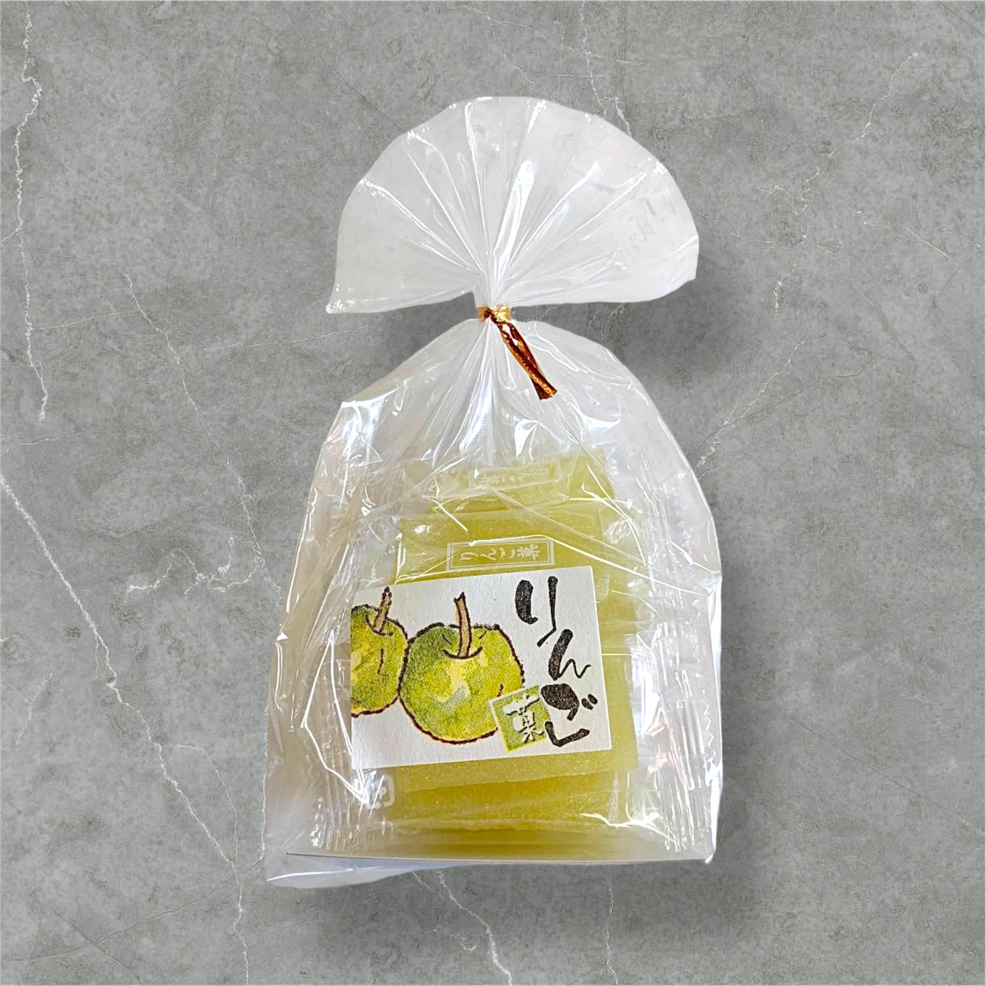 原材料:水飴(国内製造)、砂糖、りんご果汁、粉末オブラート(でん粉)/ゲル化剤(ペクチン)、酸味料、香料、着色料(紅麹、くちなし)、レシチン(大豆由来)