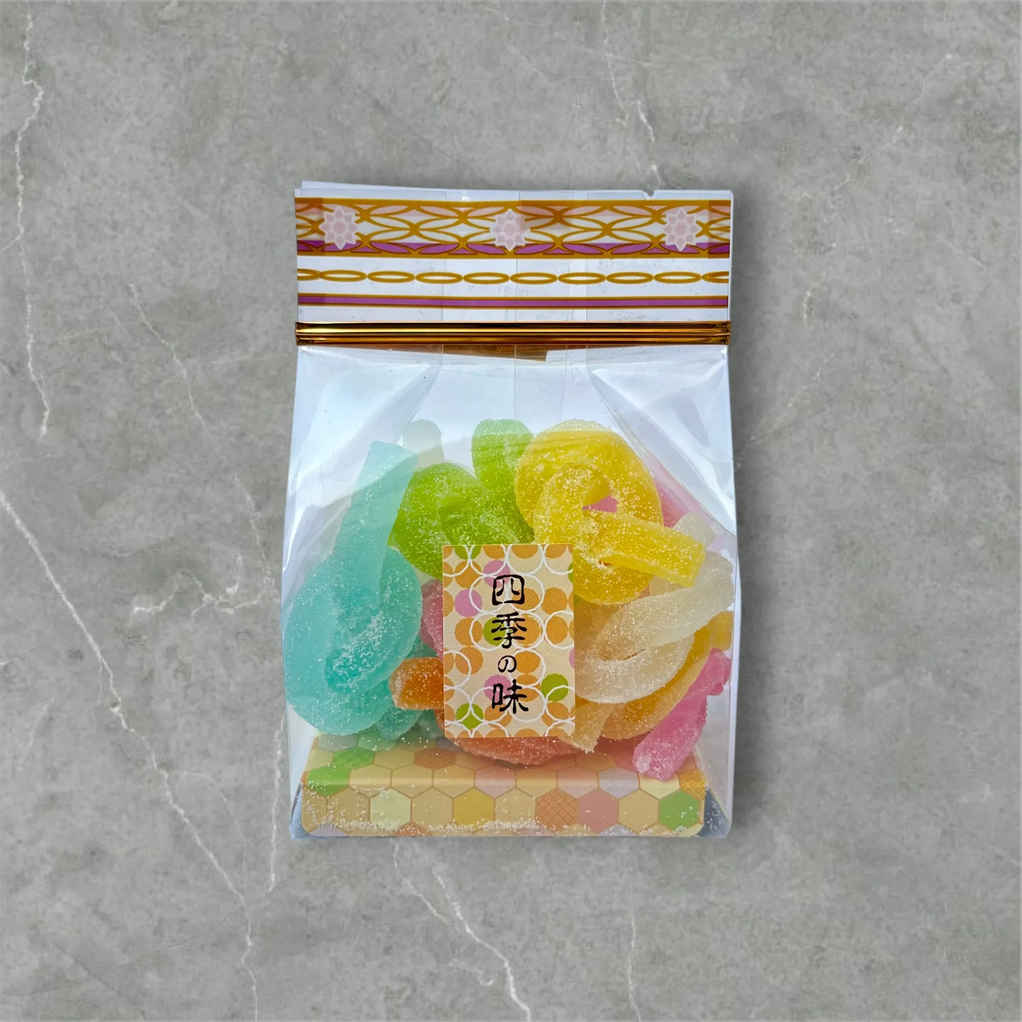 原材料:水飴(国内製造)、砂糖、寒梅粉(もち米)、寒天/香料、着色料(赤3、黄4、青1)