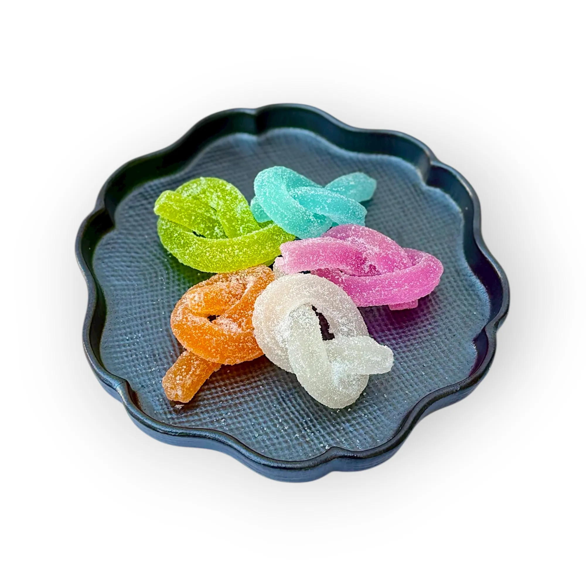 国産最上級の寒天を使用したゼリー。職人の手仕事で、くるりと繊細な結び形を表現。カラフルな彩りで仕上げました。