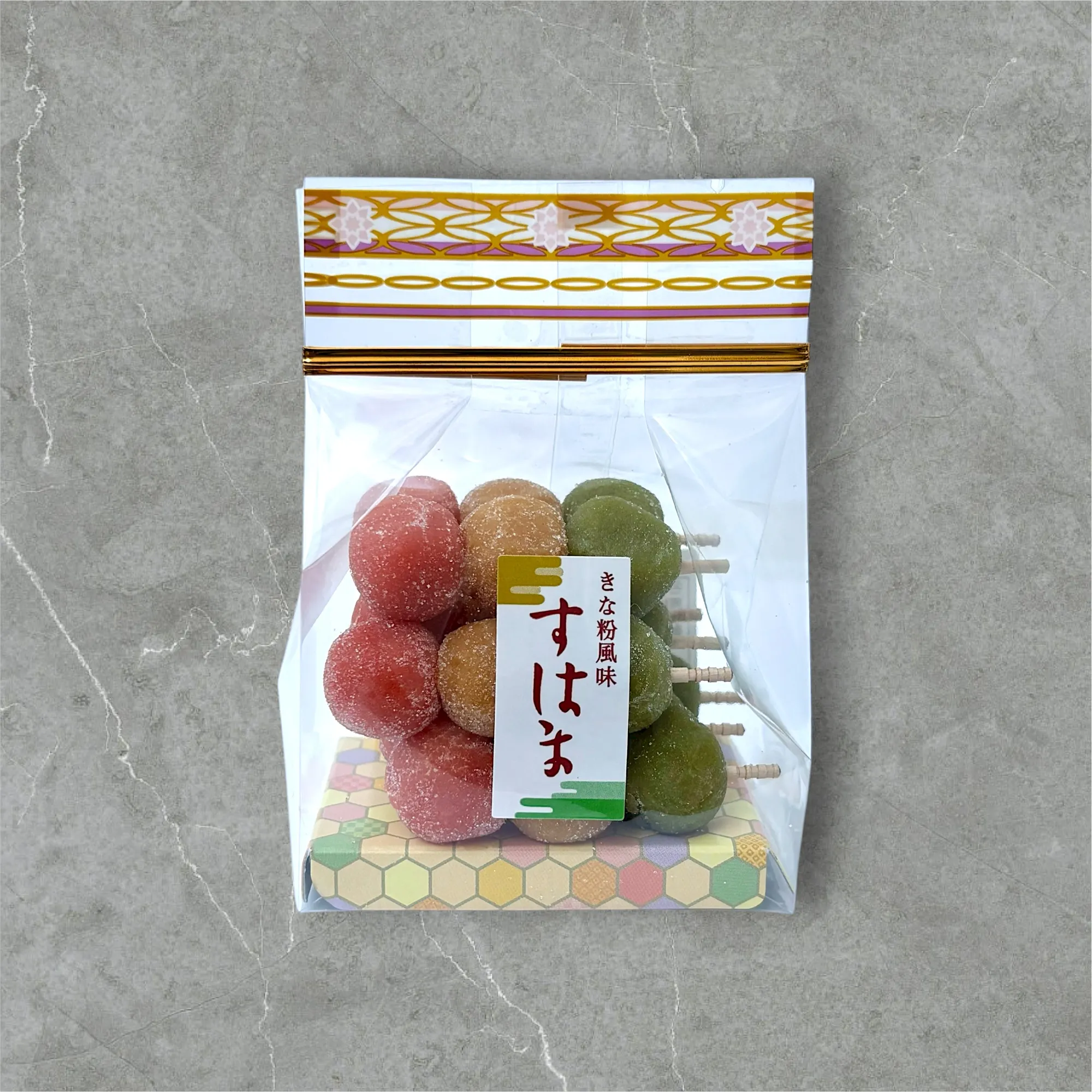 原材料:砂糖(国内製造)、きな粉(大豆)、水飴、寒梅粉(もち米)/着色料(赤3、黄4、青1)