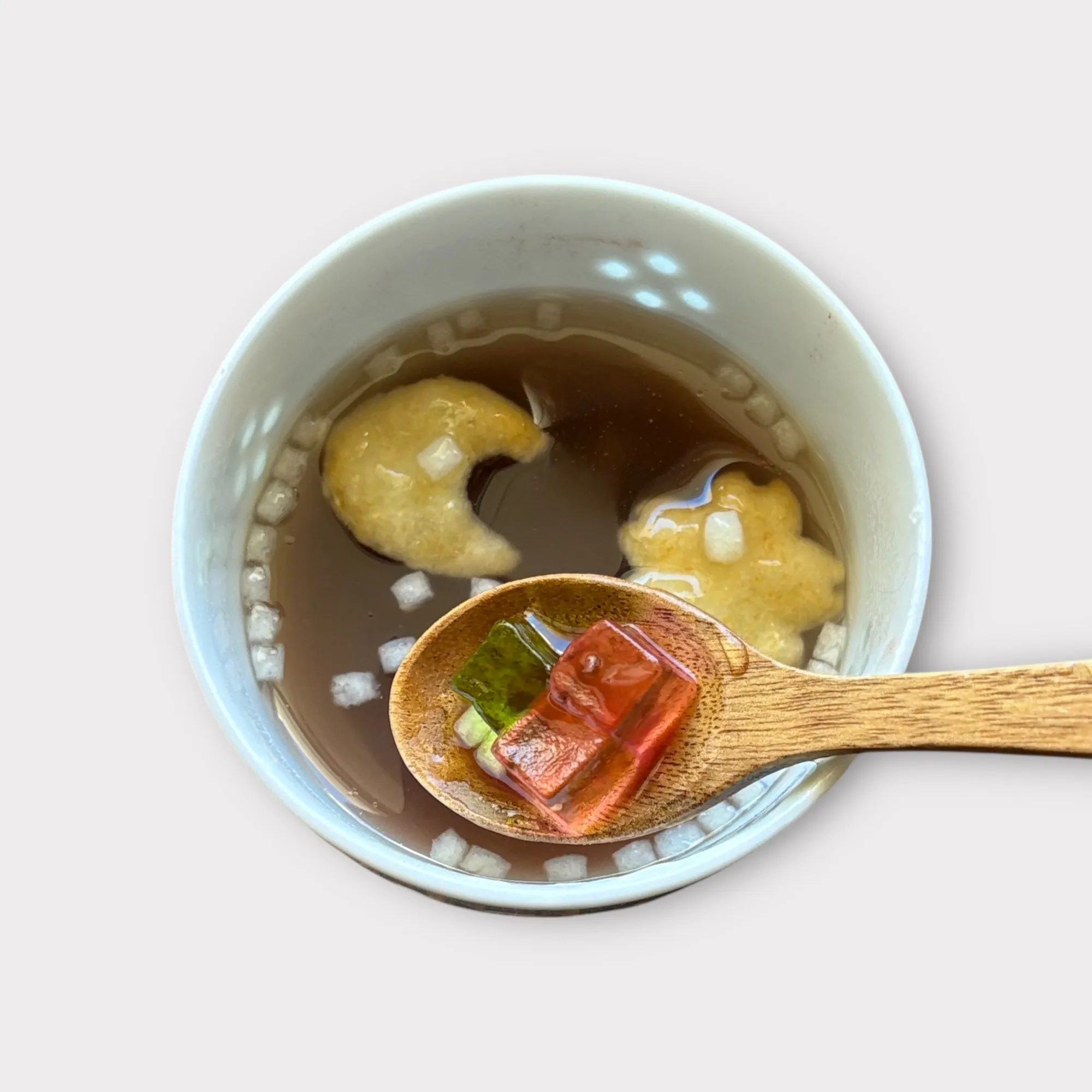 原材料:砂糖(国内製造)、乾燥餡、澱粉、餅米、水あめ、寒天、塩/着色料(赤3、黄4、青1)
