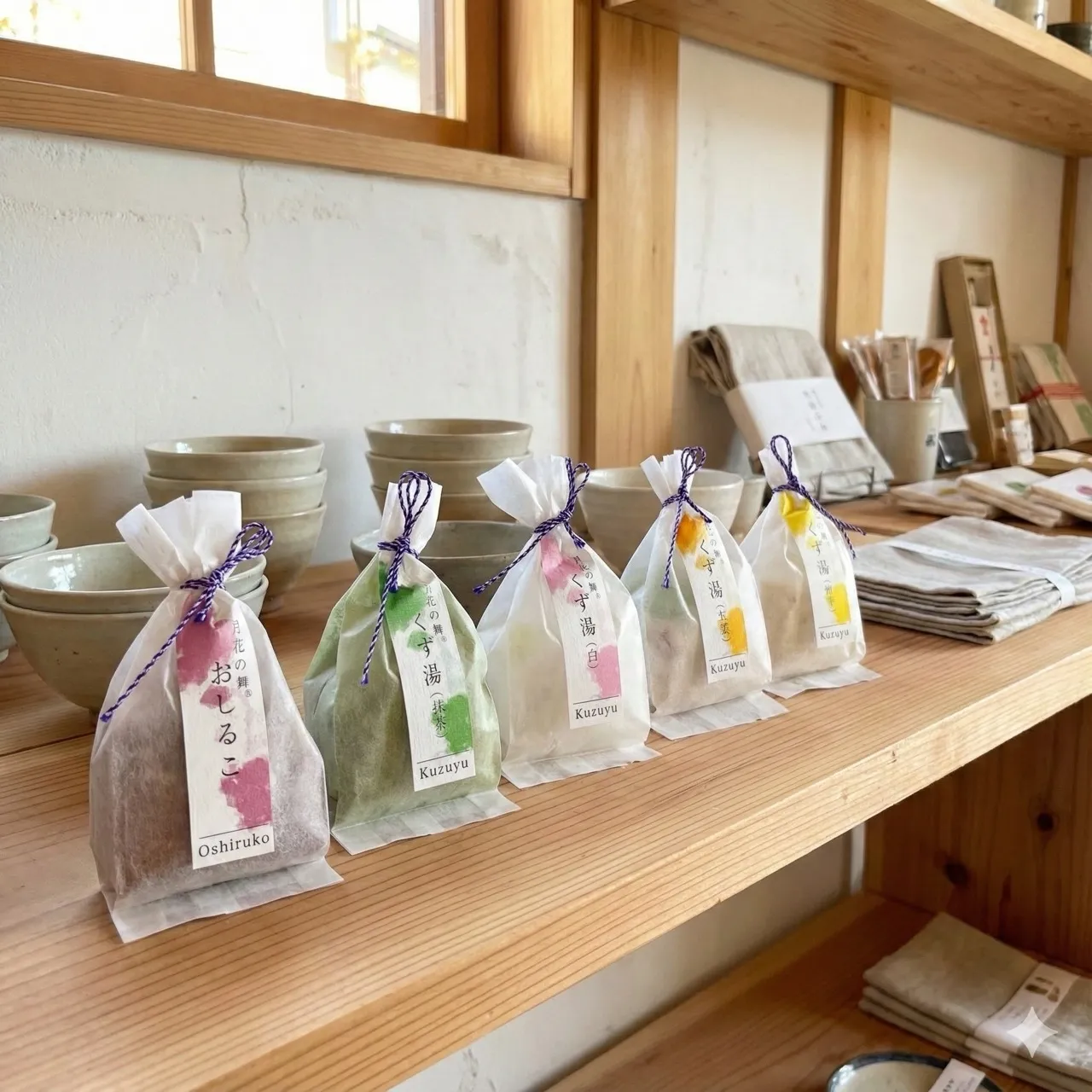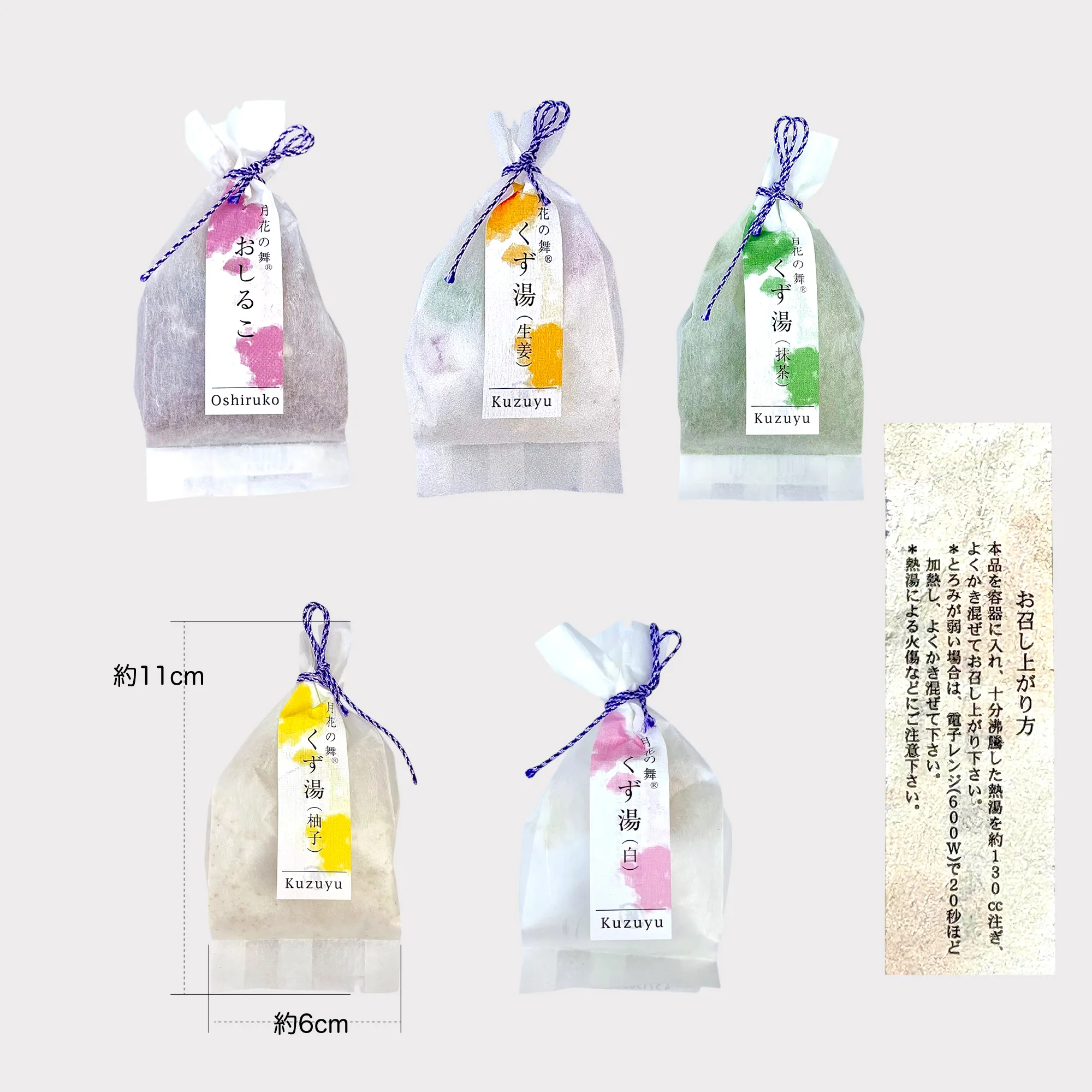熱湯を注げば舞い踊る、愛らしい形のあられや彩り豊かなゼリー。風情のある和紙に包まれた、くず湯やしるこのシリーズです。