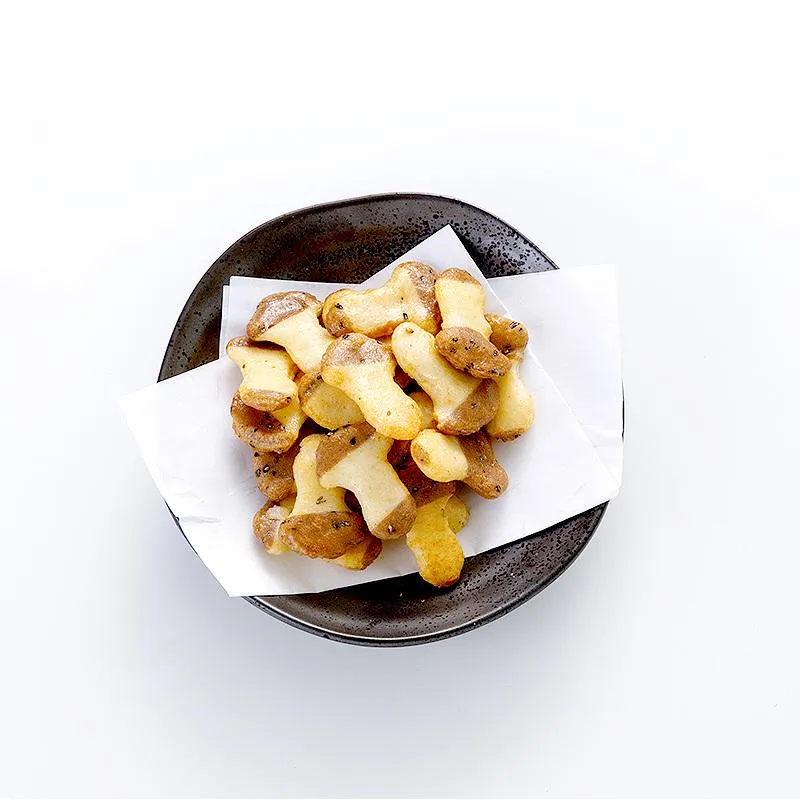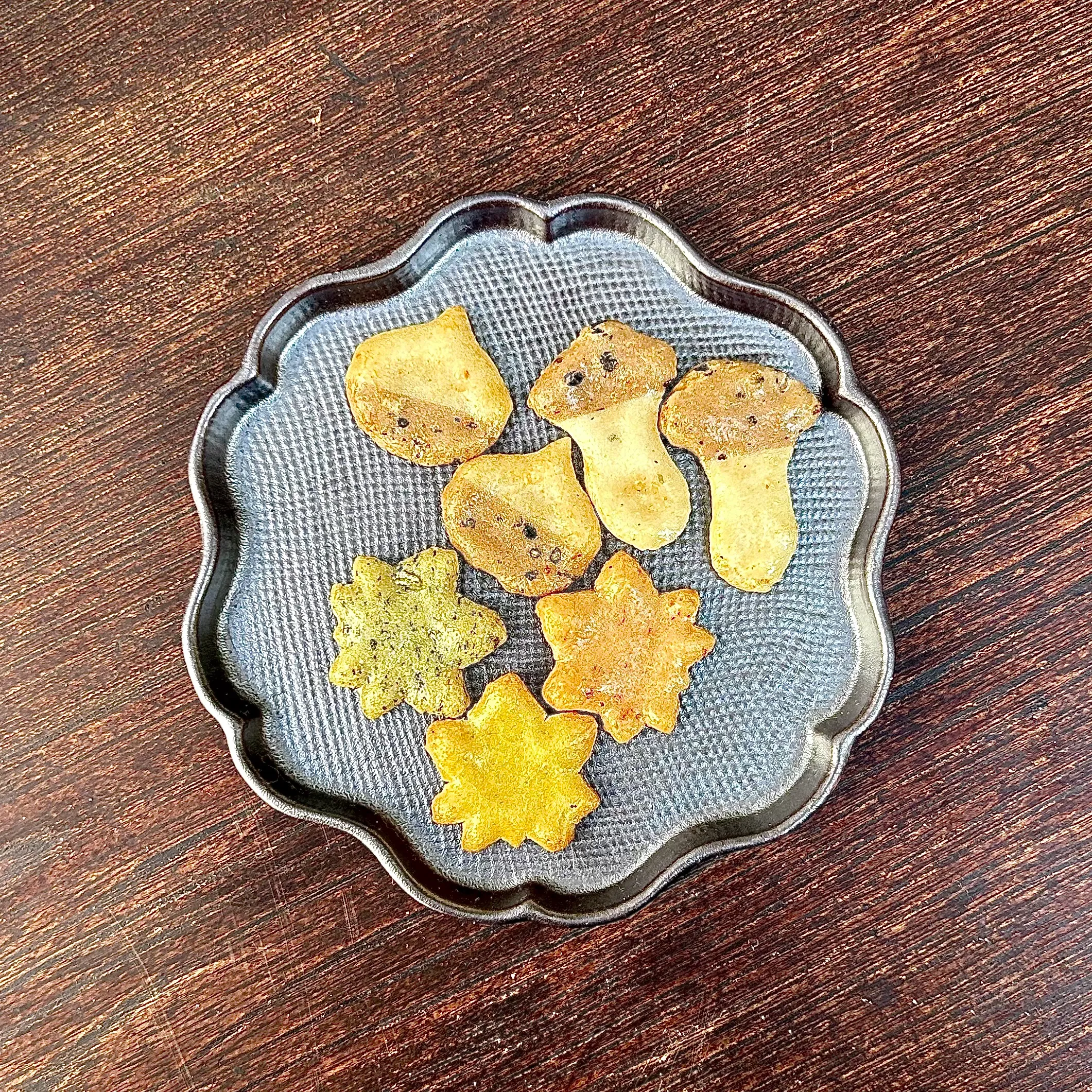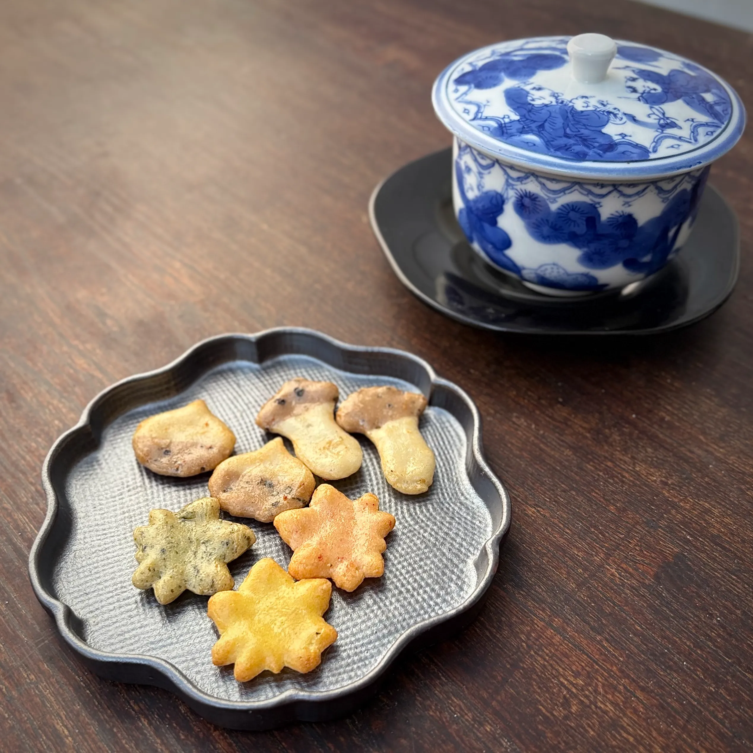 独自の技術で仕上げた“姿あられ”。傘の部分だけを褐色に染め、昆布と胡麻を加えた松茸。あっさり白醤油風味、微かに松茸の香りも楽しめます。